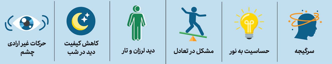 - حساسیت به نور یا مشکل در دیدن در تاریکی.
