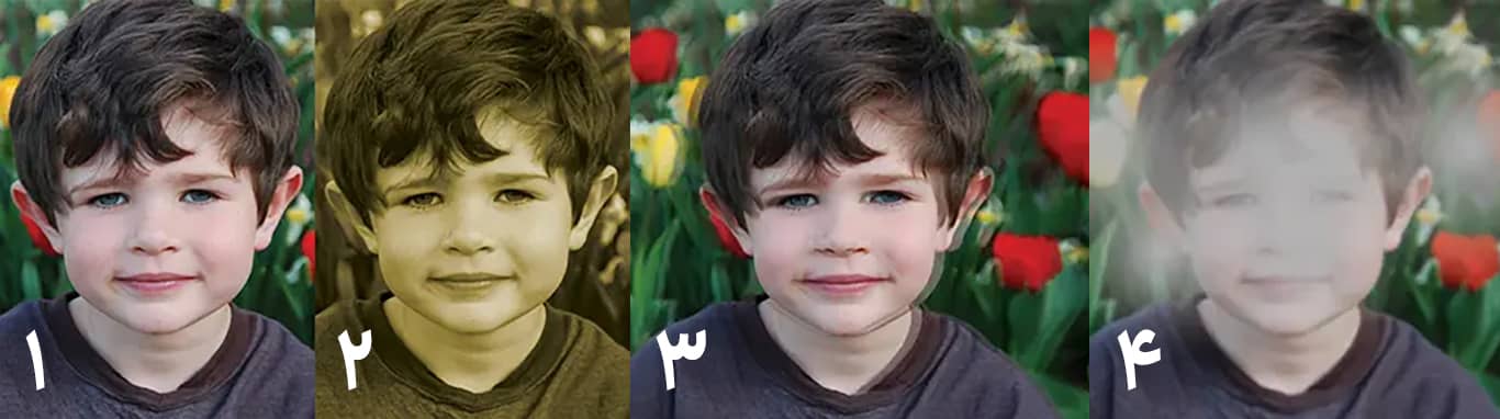 1. چشم سالم 2. آب مروارید می تواند باعث شود تصاویر مات یا زرد به نظر برسند. 3. آب مرورید می تواند باعث اعوجاج یا تصاویر شبح وار شود. 4. تاری دید یا کم نور شدن دید از علائم آب مروارید است.